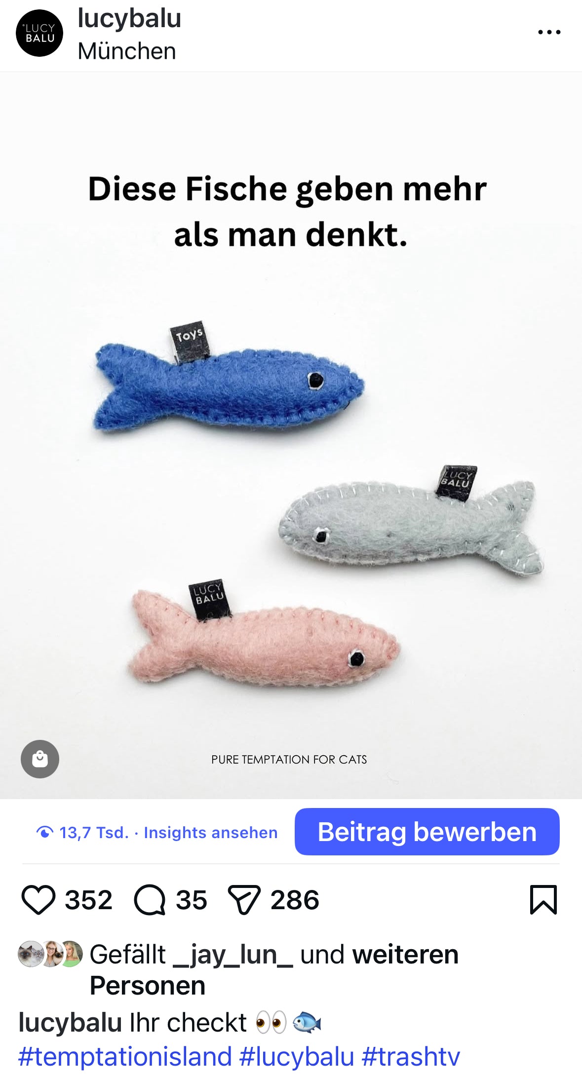 Als er dachte, die Kameras würden nicht laufen, machte Aleksandar Petrovic in Temptation Island diese Aussage: "Meine Frau gibt nicht, wie diese Fische." Hinterher bereute er die böse Aussage über seine Verlobte Vanessa Nwattu. Zu spät, da tobte das Netz bereits. Ein Off-Cam-Skandal war geboren. Mit einem Augenzwinkern beteiligte sich unser Social Media Team mit einem Post an der Debatte. Im Post wird das Sardines Katzenspielzeug gezeigt - zusammen mit dem Satz "Diese Fische geben mehr als man denkt". "So geht Marketing" kommentierte da sogar RTL Plus.