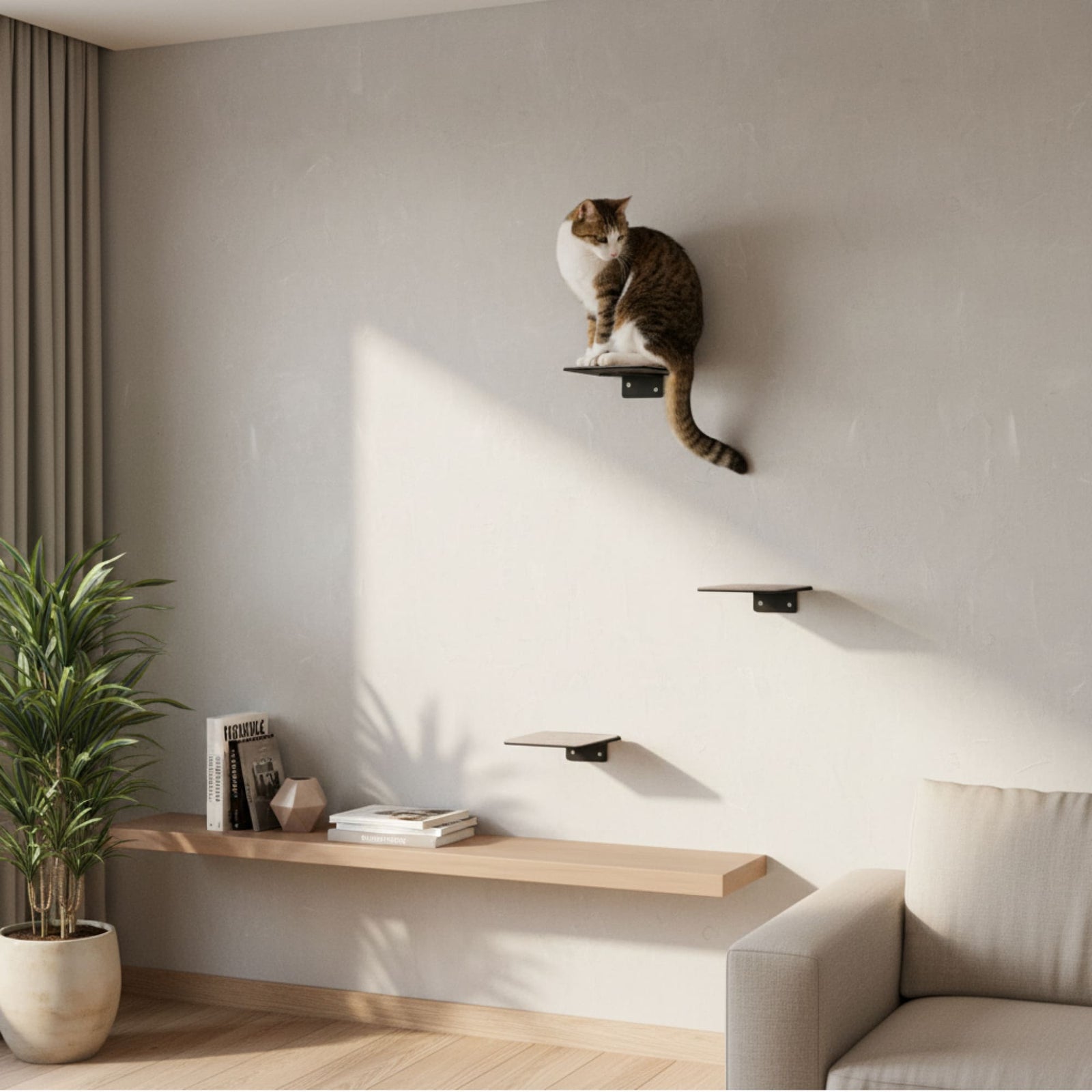 Die STEPS Katzentreppe ist die Antwort auf moderne Wohnräume, in denen Katzen mehr vertikalen Platz benötigen, ohne dass der Raum überladen wirkt. Viele Katzenhalter suchen nach einer platzsparenden Alternative zum klassischen Kratzbaum. Genau hier setzen die STEPS zur Wandmontage an. Die drei filigranen, aber extrem stabilen Metallstufen schaffen eine dezent integrierte Aufstiegshilfe, die sich harmonisch in jedes Interieur einfügt. Ob als Katzentreppe in der Wohnung hinter dem Sofa, als Verbindung zu Fensterbrettern oder als wandmontierte Lösung für Kletterkünstler in höheren Etagen: STEPS eröffnet neue Möglichkeiten, den Lebensraum deiner Katze vertikal zu erweitern. Besonders Hauskatzen profitieren davon, denn mehr Bewegung, mehr Kletterflächen und spannende Perspektiven fördern sowohl körperliche Fitness als auch mentale Auslastung. Die Anti-Slip-Pulverbeschichtung bzw. die rutschfeste Filzauflage sorgt für sicheren Halt, während abgerundete Ecken Verletzungen verhindern. Im Gegensatz zu improvisierten DIY-Lösungen („Katzentreppe selber bauen“) bietet STEPS maximale Sicherheit und Langlebigkeit – ein echter Vorteil im Alltag. Dank deutscher Qualitätsstandards, stabilem Stahl und cleverem Design entsteht ein langlebiges Produkt, das Katzen und Menschen begeistert.