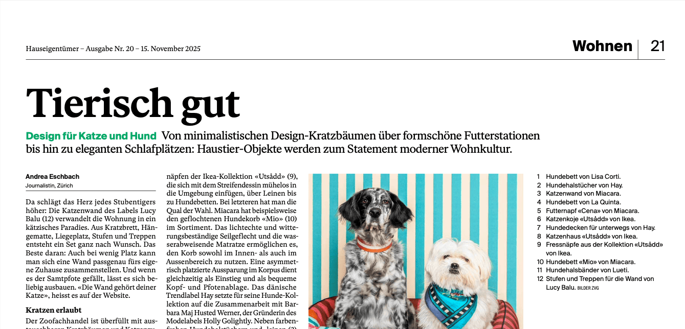 Das Schweizer Magazin Der Hauseigentümer schreibt über den Trend zu mehr designorientierten Produkten für Hunde- und Katzenbesitzer. "Von minimalistischen Design-Kratzbäumen über formschöne Futterstationen bis hin zu eleganten Schlafplätzen: Haustier-Objekte werden zum Statement moderner Wohnkultur." Da darf LucyBalu neben Hay, MiaCara oder Ikea nicht fehlen.