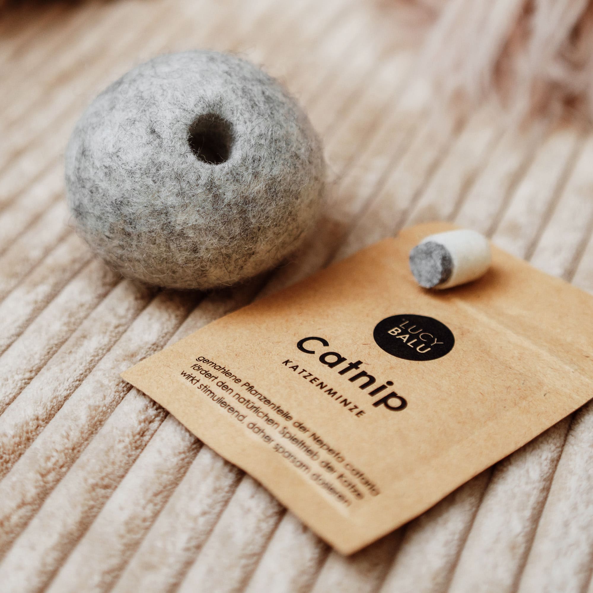 Unsere Katze spielt nicht so gerne, aber um sie dazu zu bringen sich mehr zu bewegen, probieren wir immer wieder etwas neues aus. Den Filzball haben wir ihr zum Geburtstag gekauft und sie hat richtig viel Freude damit! Ich freue mich darüber, etwas gefunden zu haben, das nicht aus Plastik besteht, sodass man auch keine Bedenken haben muss, falls sie kleine Fäden verschluckt.
