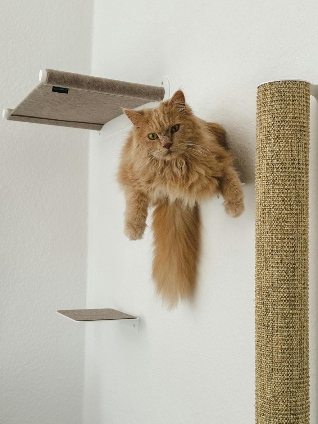 Die schwebende Treppe für Katzen an der Wand.