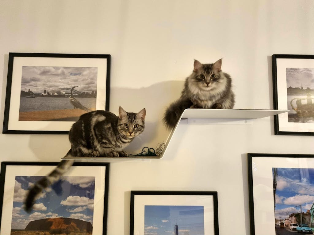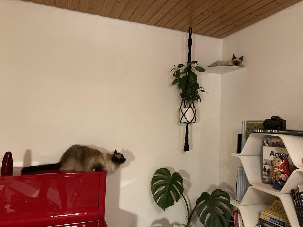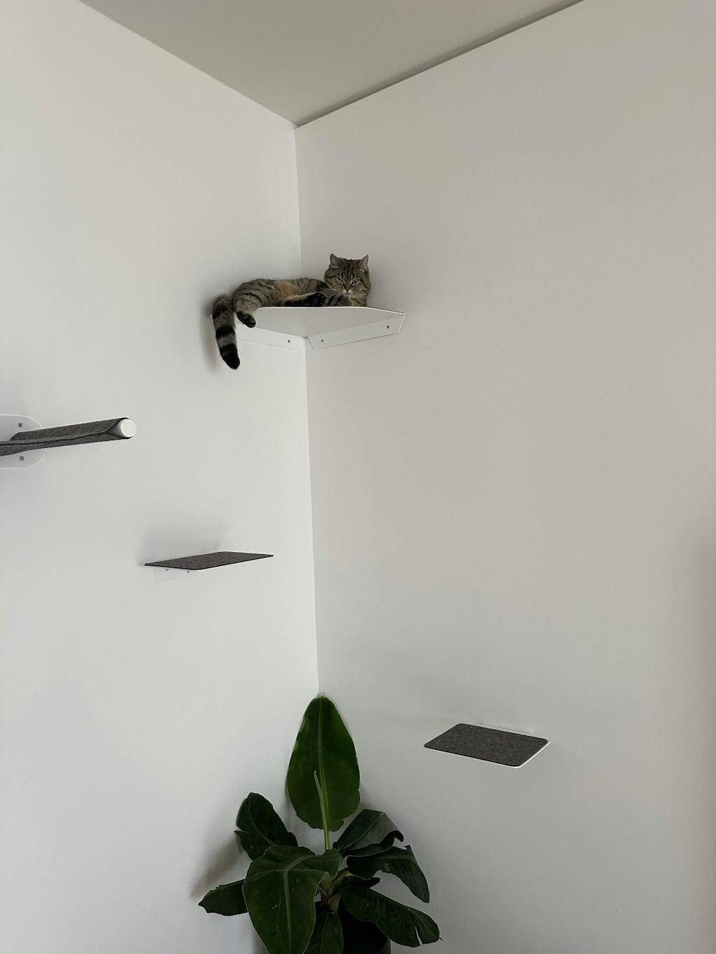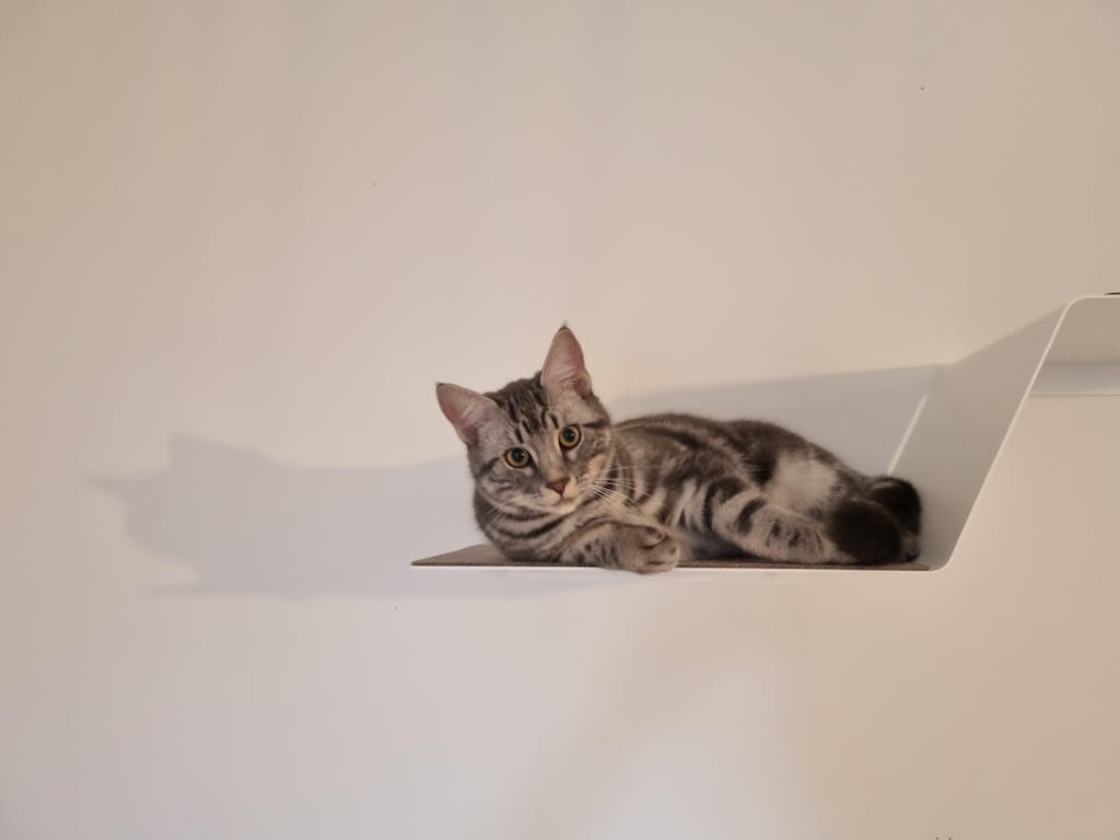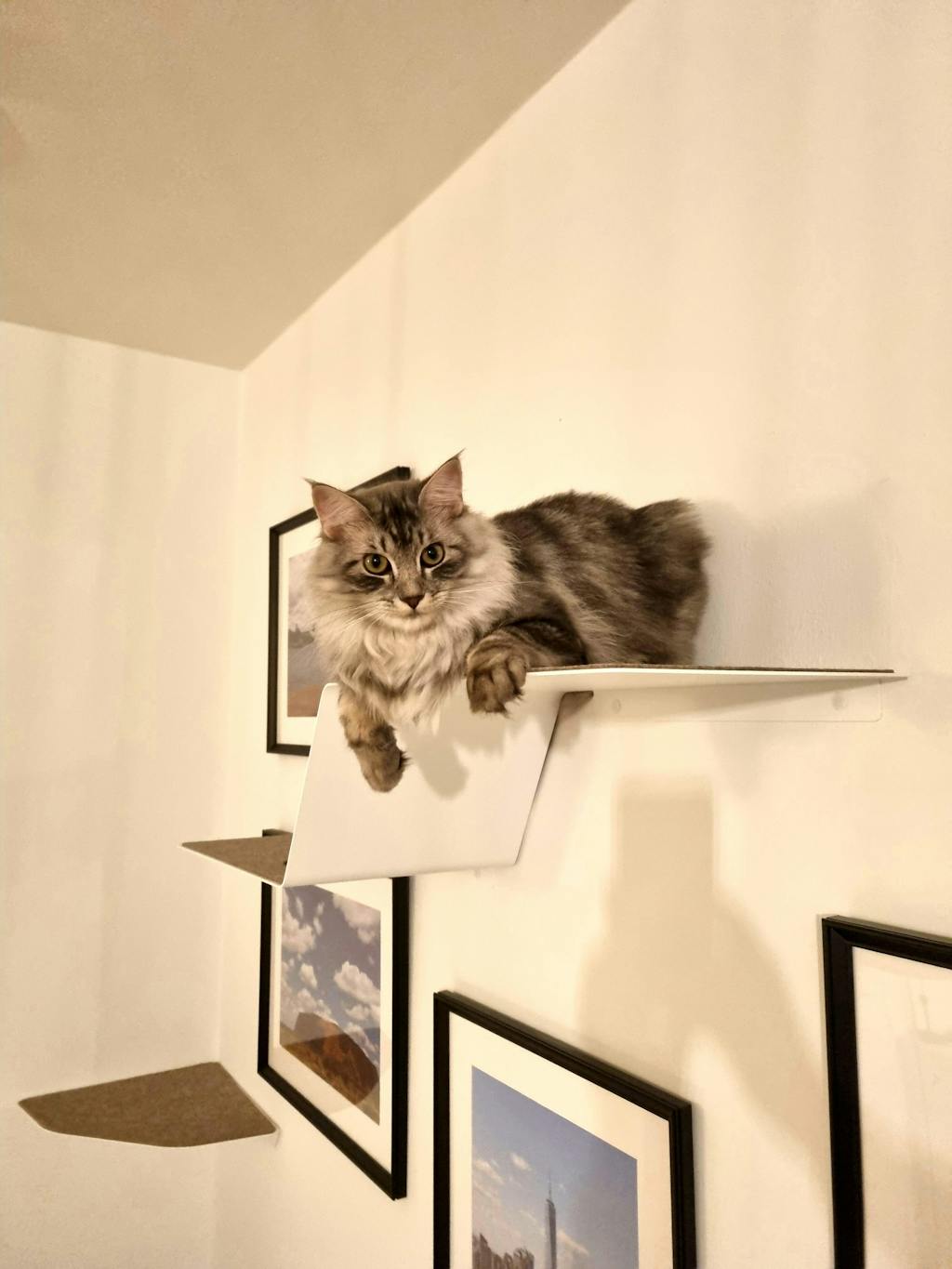 Ich habe meinen beiden Maine Coon-Hauskatzen-Mix-Katern mit der Wandliege und der Stufe eine Aussichtsplatform eingerichtet, auf der sie sich sichtlich wohl fühlen.