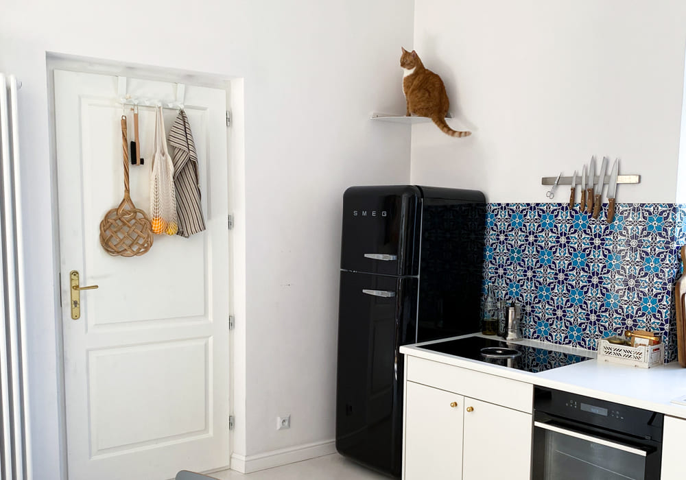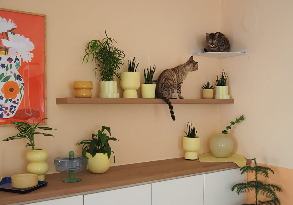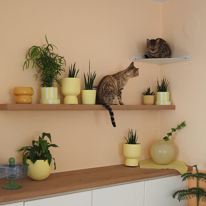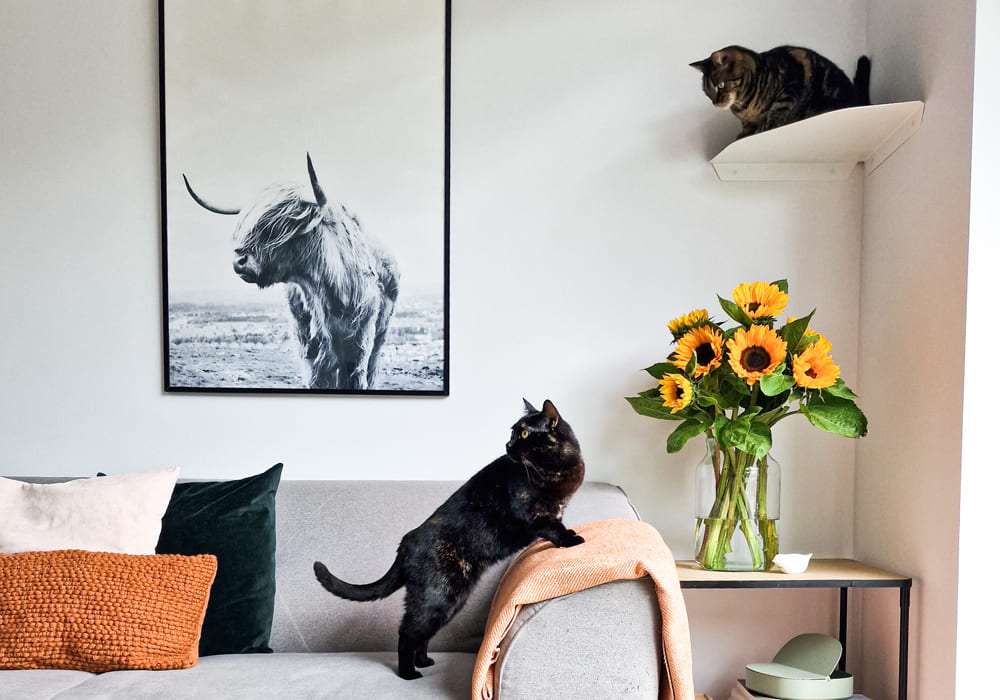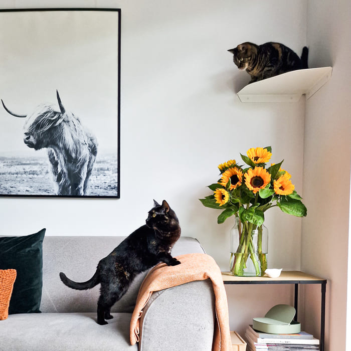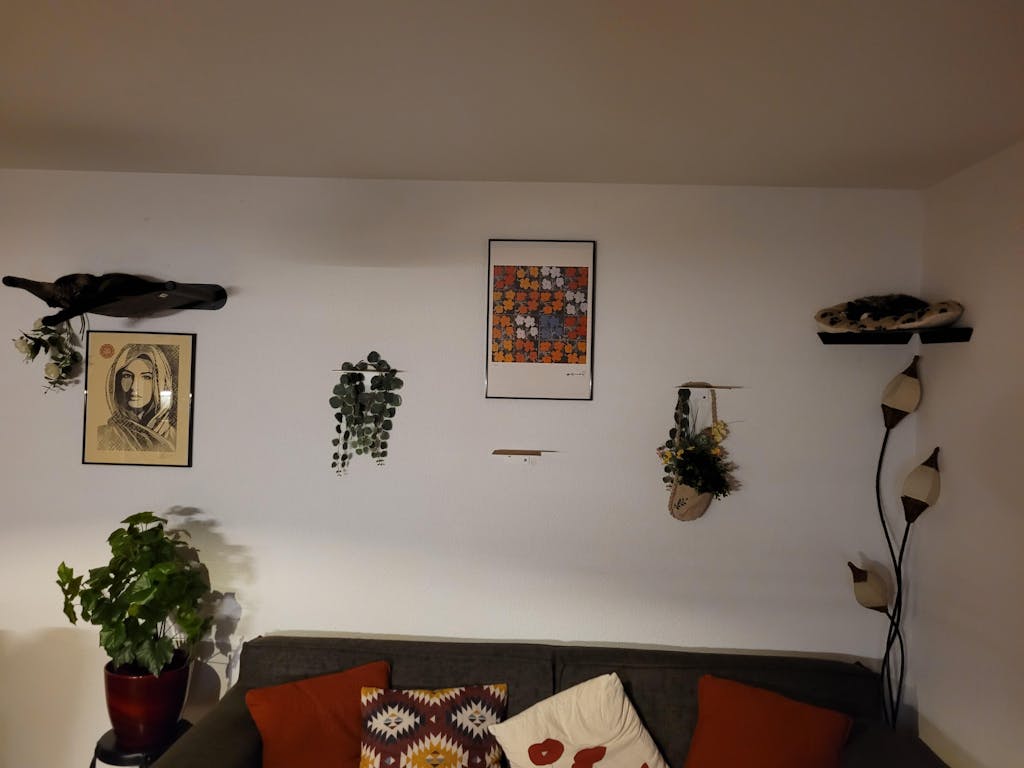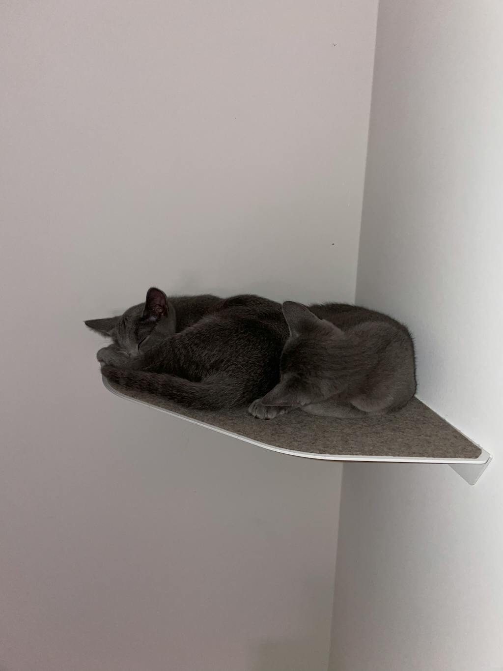 Ich habe meinen beiden Maine Coon-Hauskatzen-Mix-Katern mit der Wandliege und der Stufe eine Aussichtsplatform eingerichtet, auf der sie sich sichtlich wohl fühlen.