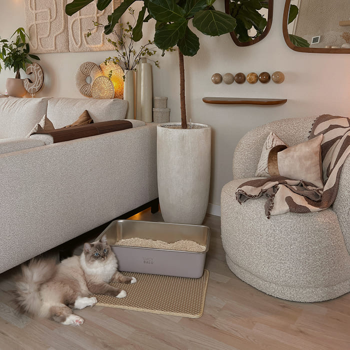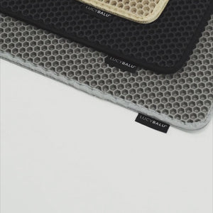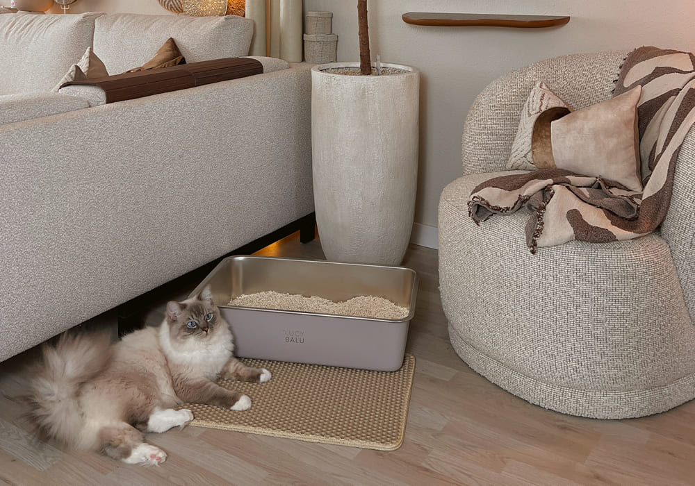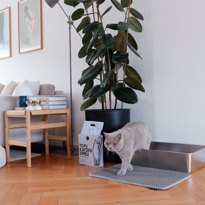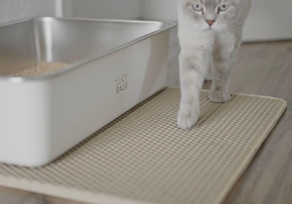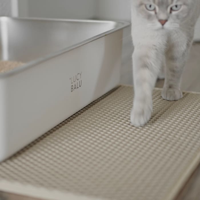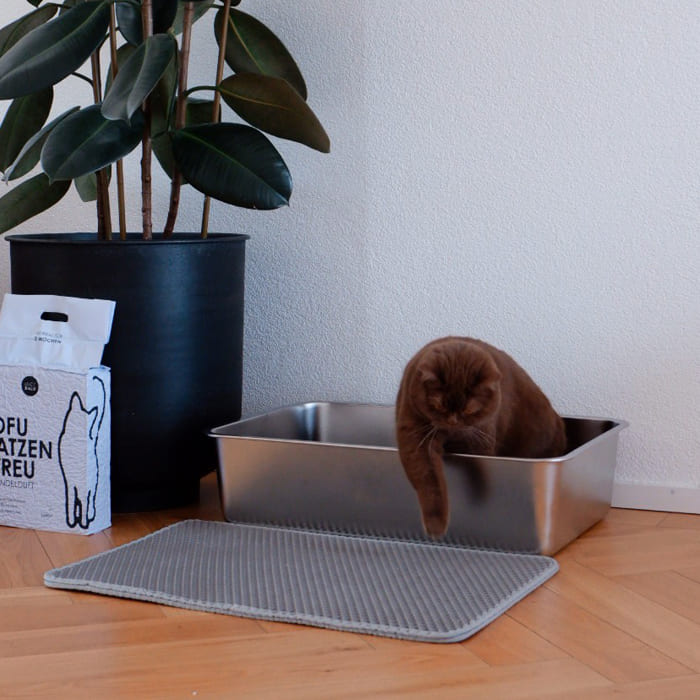 Wo ist das ganze Katzenstreu hin? Die doppellagige LOOMAT Katzenstreumatte fängt nach dem Toilettengang zuverlässig herabfallendes Katzenstreu auf, schützt damit deine Böden und sorgt so für weniger Krümel in den Socken.
