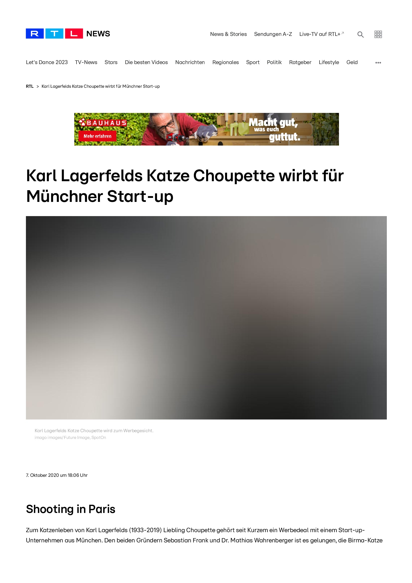 "Zum Katzenleben von Karl Lagerfelds (1933-2019) Liebling Choupette gehört seit Kurzem ein Werbedeal mit einem Start-up-Unternehmen aus München. Den beiden Gründern Sebastian Frank und Dr. Mathias Wahrenberger ist es gelungen, die Birma-Katze des verstorbenen Star-Designers für ihre Marke zu gewinnen. "Was wie ein Märchen klingt, ist unsere Realität geworden", heißt es auf ihrer Website.".
