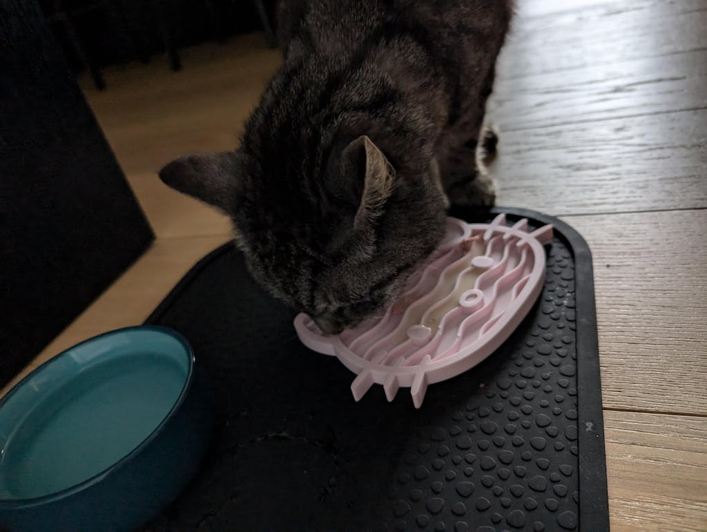 • Prolonged eating. No more gobbling, just slow and happy eating. Simply spread wet food, pastes or yogurt on it.