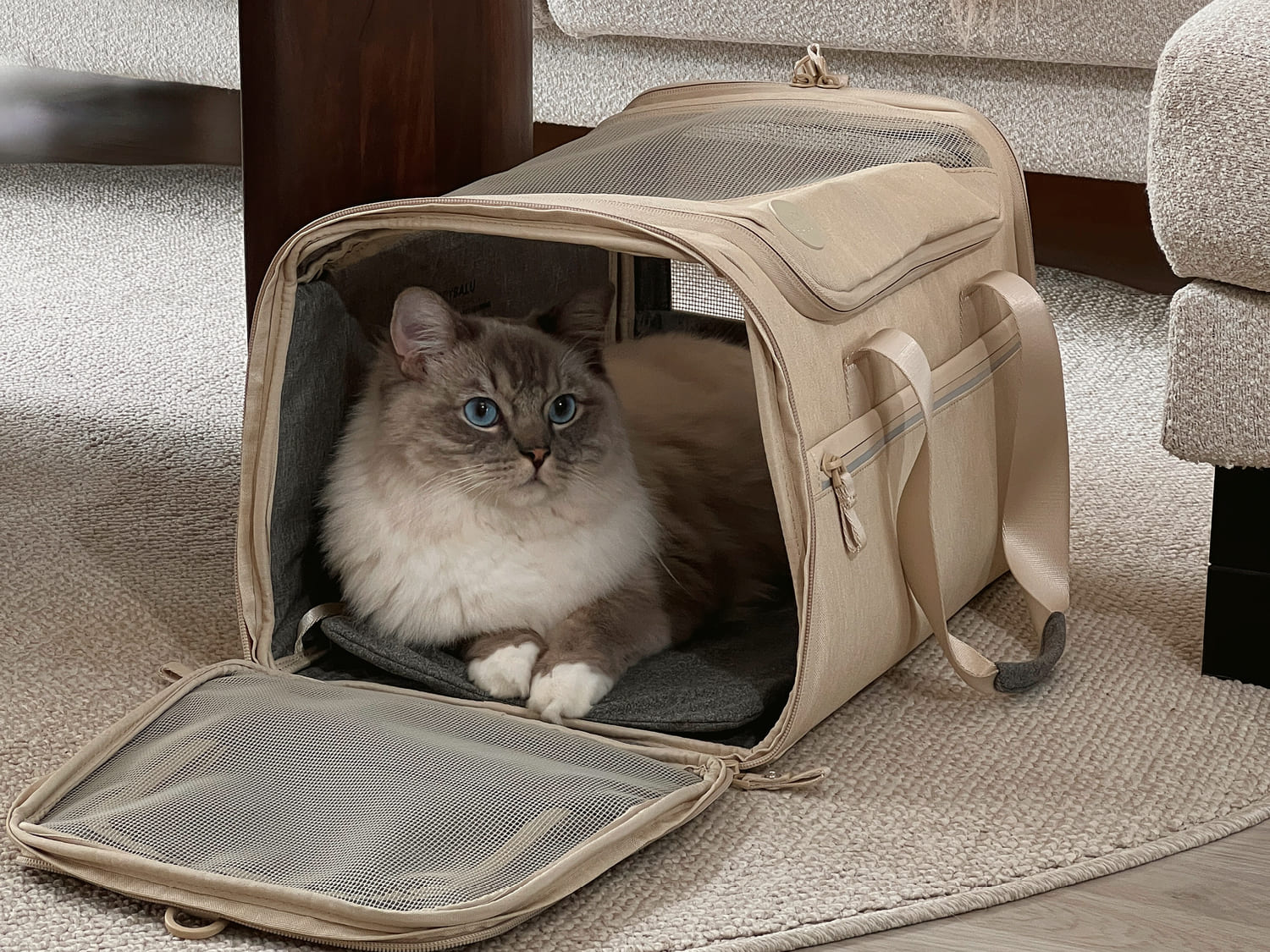 Der erste Schritt ist immer der Transport. Eine sichere, bequeme Transporttasche wie die CHECK-IN Transporttasche oder der HOP-ON Katzenrucksack sorgen dafür, dass deine Katze sich geschützt fühlt – und nicht wie in einer klappernden Kiste ausgeliefert. Wichtig: Die Transporttasche sollte nicht nur „für den Ernstfall“ hervorgeholt werden. Lass sie offen in der Wohnung stehen, leg eine Decke hinein, vielleicht ein paar Leckerlis. Ziel: Die Tasche gehört zum Alltag.