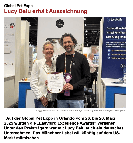 Der Ladybird Excellence Award wird jährlich an Marken verliehen, die mit Innovationskraft, Qualität und Haltung in der Heimtierbranche Maßstäbe setzen. Zum vollständigen Artikel im ZZA-Magazin geht’s hier: Global Pet Expo: LucyBalu erhält Auszeichnung – zza-online.de