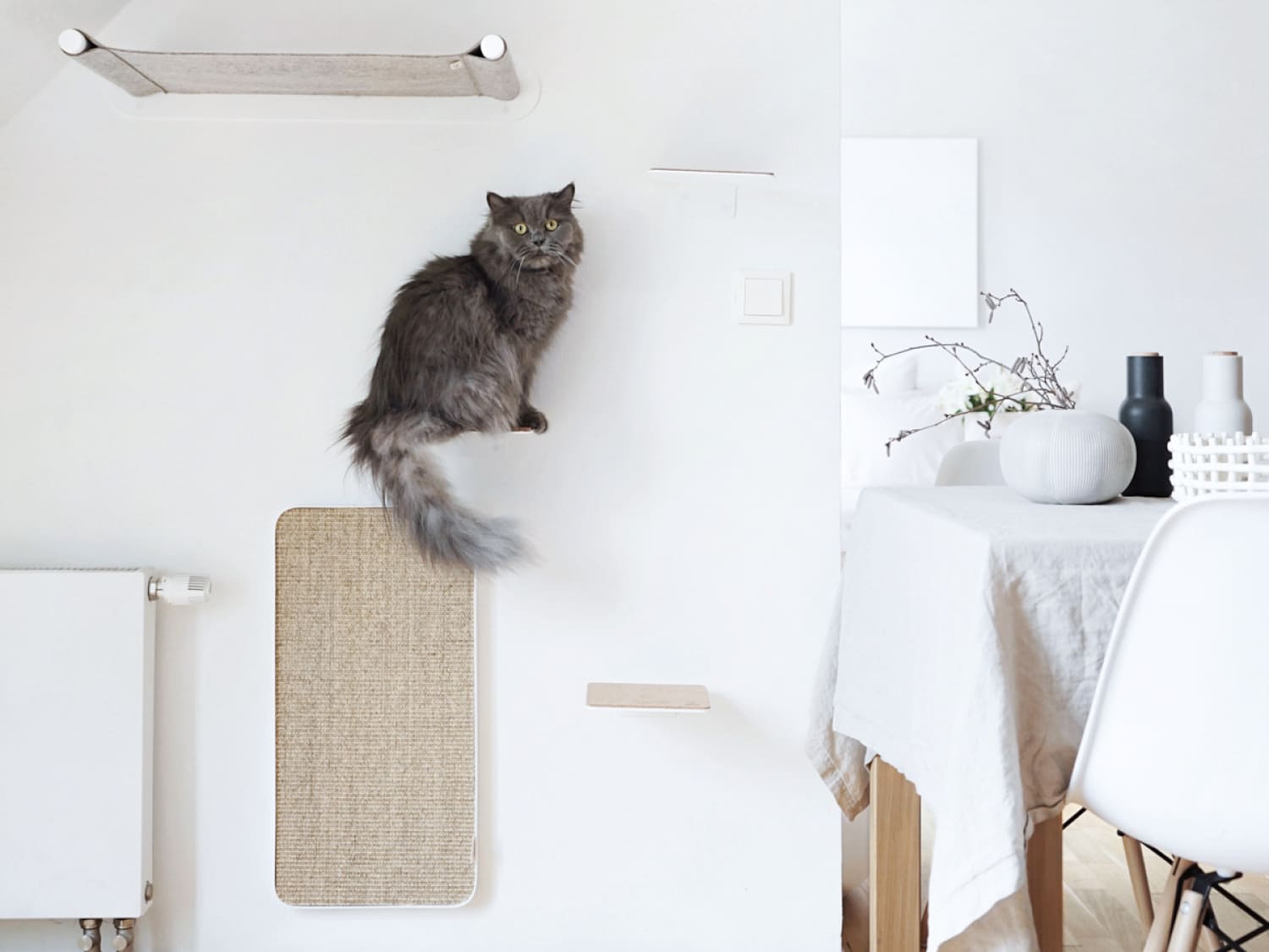 Wichtig für einen Katzenhaushalt sind außerdem Möglichkeiten, wo eine Katze toben, klettern und kratzen kann. Dabei bieten sich vor allem Kratz- und Klettermöbel zur Wandmontage an. Diese gliedern sich perfekt in eine Wohnung ein und nehmen dabei keinen wertvollen Wohn-Platz weg. Besonders das Wetzen der Krallen ist für unsere Fellnasen nicht nur aus pflegenden Gründen wichtig. Neben der Maniküre spielt vor allem das Markieren des eigenen Reviers eine große Rolle. Achte also darauf, dass deine Kratzmöbel auch dazu dienen, dass die Katze ordentlich ihre Krallen wetzen kann. Deine Möbel werden es dir danken. Durch die Klettermöbel an der Wand haben Katzen dann ihr gesamtes Revier im Blick und können diese als Ausguck oder aber auch zum Ausruh-Ort nutzen.