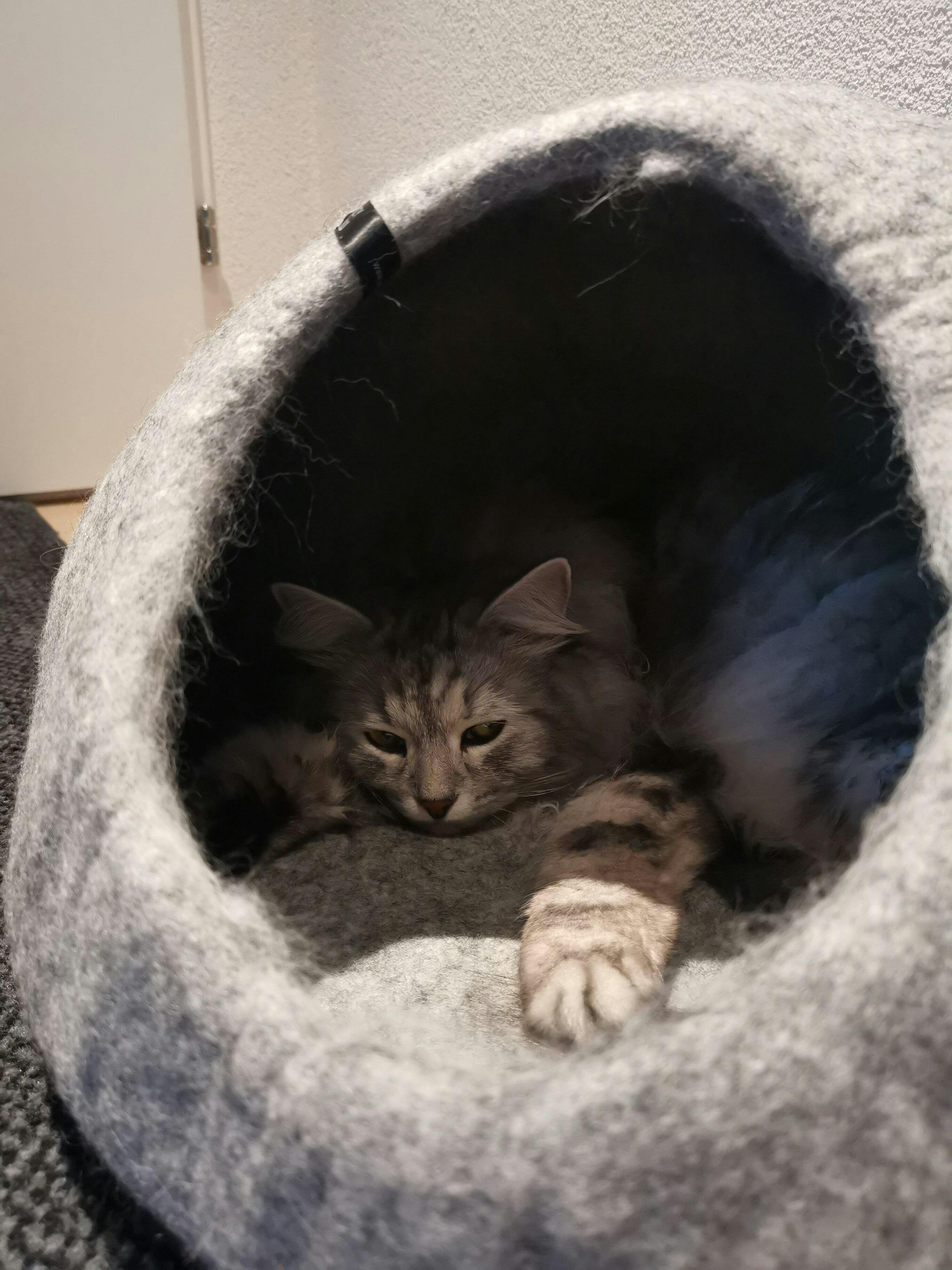 Ah, poter essere un gatto - non c’è posto migliore per nascondersi dal mondo che nella cuccia di feltro PEBBLE: probabilmente la tana per gatti più accogliente al mondo.