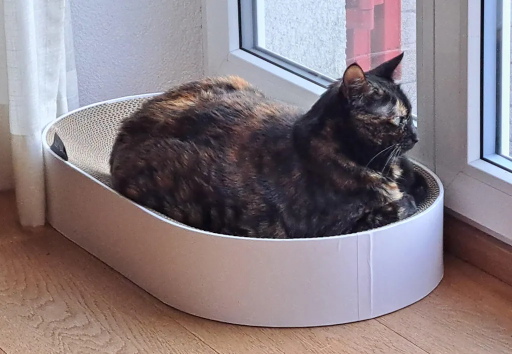 Das Kratzbett ist wirklich schön. Unsere beiden Katzen lieben es zum dösen, beobachten und zur Körperpflege. (sie können sich wunderbar abstützen)