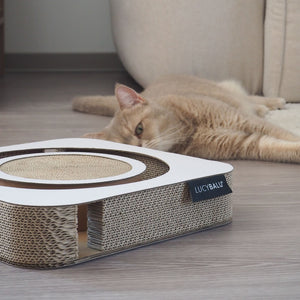 • Krallen erlaubt. In der Mitte wartet eine robuste Kratzfläche aus Wellpappe – gut für die Krallen, noch besser für deine Couch.