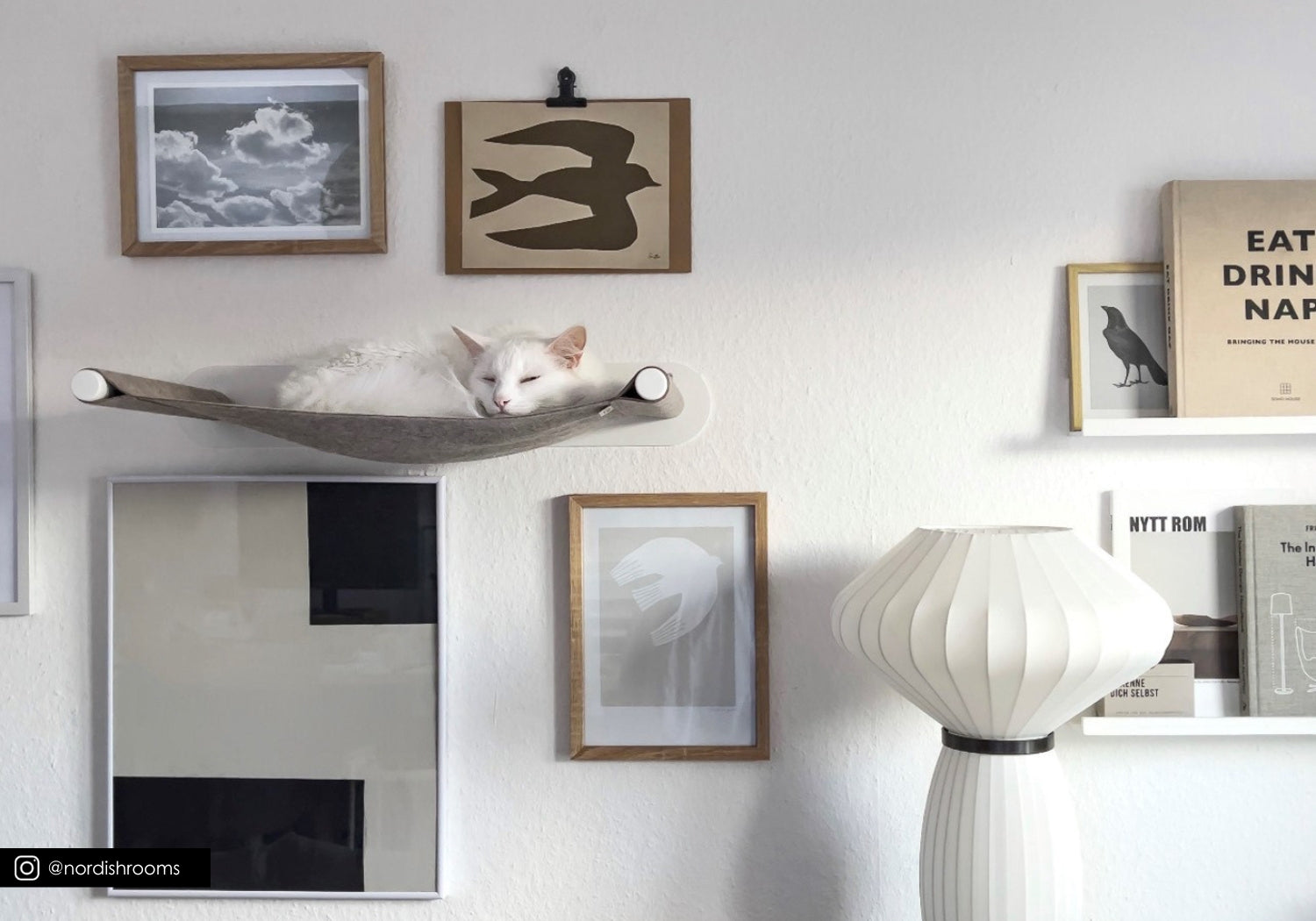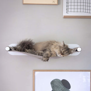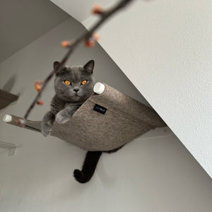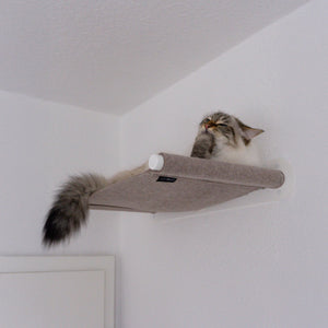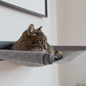 Mit unserer wandmontierten SWING Katzen Hängematte kannst du für deine Katze ganz neue Lieblingsplätze schaffen, indem du deine Wände ausnutzt. Die Hängematte ist ein echter Hingucker. Sie wird aus natürlichem Wollfilz hergestellt und zieht Katzen nahezu magisch an. Dein Stubentiger genießt von der Hängematte aus den Überblick und profitiert von den wärmespeichernden Eigenschaften des Filz. Der Wollfilz absorbiert zudem unangenehme Gerüche und besitzt durch die natürlichen Öle des Merinoschaf-Haares eine selbstreinigende Wirkung. Das hochwertige pulverbeschichtete Metallgestell sorgt mit klarer, funktionaler Struktur für die nötige Leichtigkeit an deinen Wänden. Sie tritt aufgrund ihrer schwebenden Eleganz optisch in den Hintergrund und wertet das Zuhause auf. Dabei schützt das breite Stahlblech die Wand vor Verfärbungen. Die SWING ist übrigens mit bis zu 15 kg belastbar - also auch für 2 kuschelnde Katzen bestens geeignet.Katzen lieben es, auf der SWING Katzenhängematte abzuhängen.