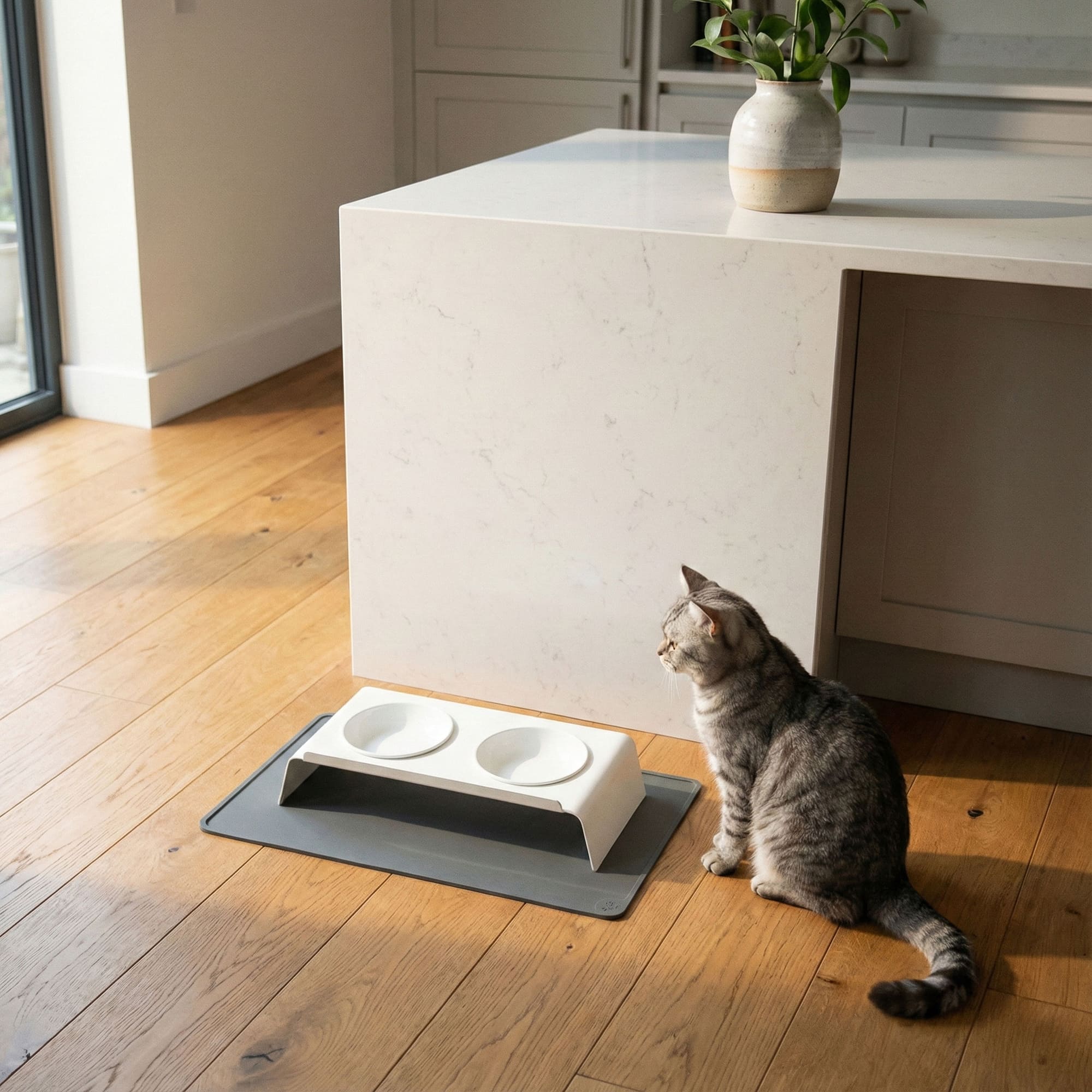 Katzen gelten als die reinlichsten Haustiere – allerdings gilt das nicht immer für ihr Essverhalten! Vor allem bei jungen Katzen wird oft geschlungen und in Mehrkatzenhaushalten entbrennt nicht selten ein Streit um den letzten Brösel Futter. Kein Wunder also, dass die Umgebung um die Futterstation oft aussieht wie ein kleines Schlachtfeld. Oft wird auch Wasser verschüttet, was wiederum auf manchen Böden für bleibende Probleme sorgen kann. Mit unserer rechteckigen Napfunterlage SQUARE kannst du solche Zustände zukünftig vermeiden. Die Silkonunterlagen können unkompliziert mit einem feuchten Tuch abgewischt werden. Bei stärkeren Verschmutzungen können sie natürlich auch mit Spülmittel oder in der Spülmaschine gereinigt werden. Am Boden klebende Futterreste und Wasserflecken gehören damit der Vergangenheit an! Dank des kleinen Randes werden herumfliegende Futterreste und Wasserspritzer zuverlässig aufgefangen. Und ganz nebenbei wird der Boden geschont – denn Kratzer durch das Verrutschen der Schüsseln oder auch Schäden durch ausgekipptes Wasser sind so praktisch ausgeschlossen. Das verwendete Silikon ist FDA-zertifiziert und besonders geruchsarm.Die Napfunterlage SQUARE sorgt für mehr Hygiene am Fressplatz